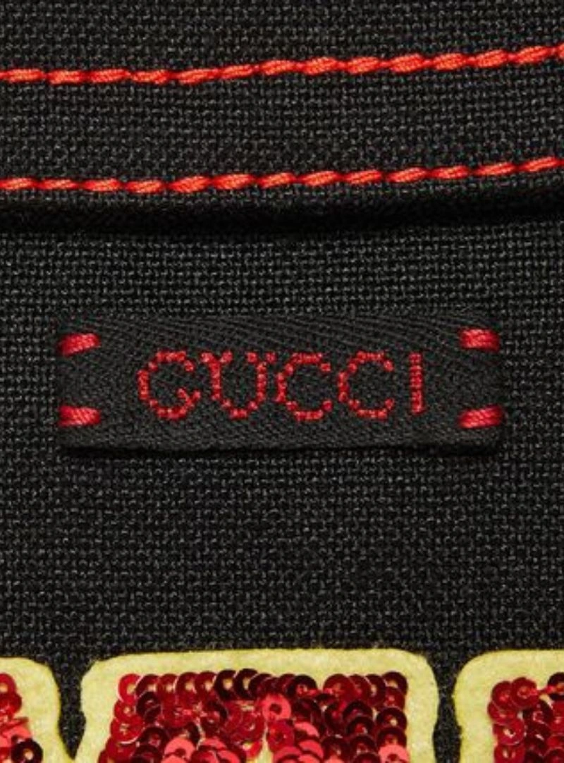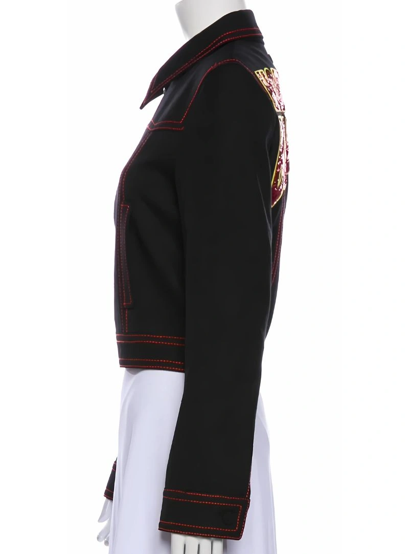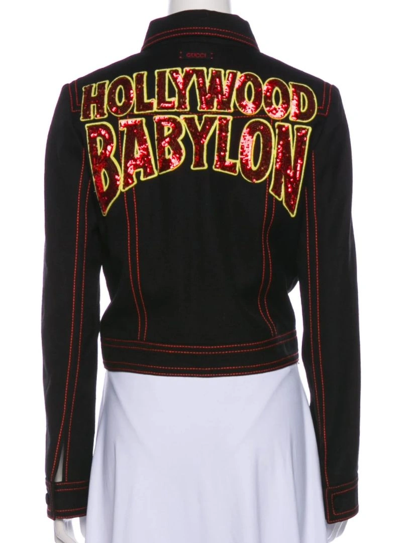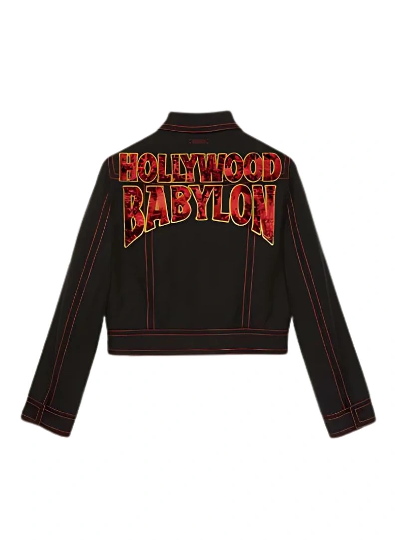 The back of this Jenna Ortega cropped Hollywood Babylon jacket has a dramatic “Hollywood Babylon” embroidery that gives it a cool, retro look. The structured silhouette gets a modern touch from the red topstitching, while the front stays simple to balance out the striking back.