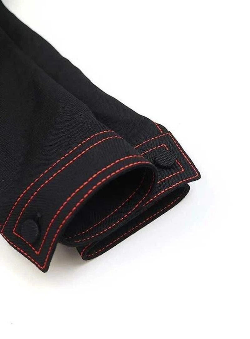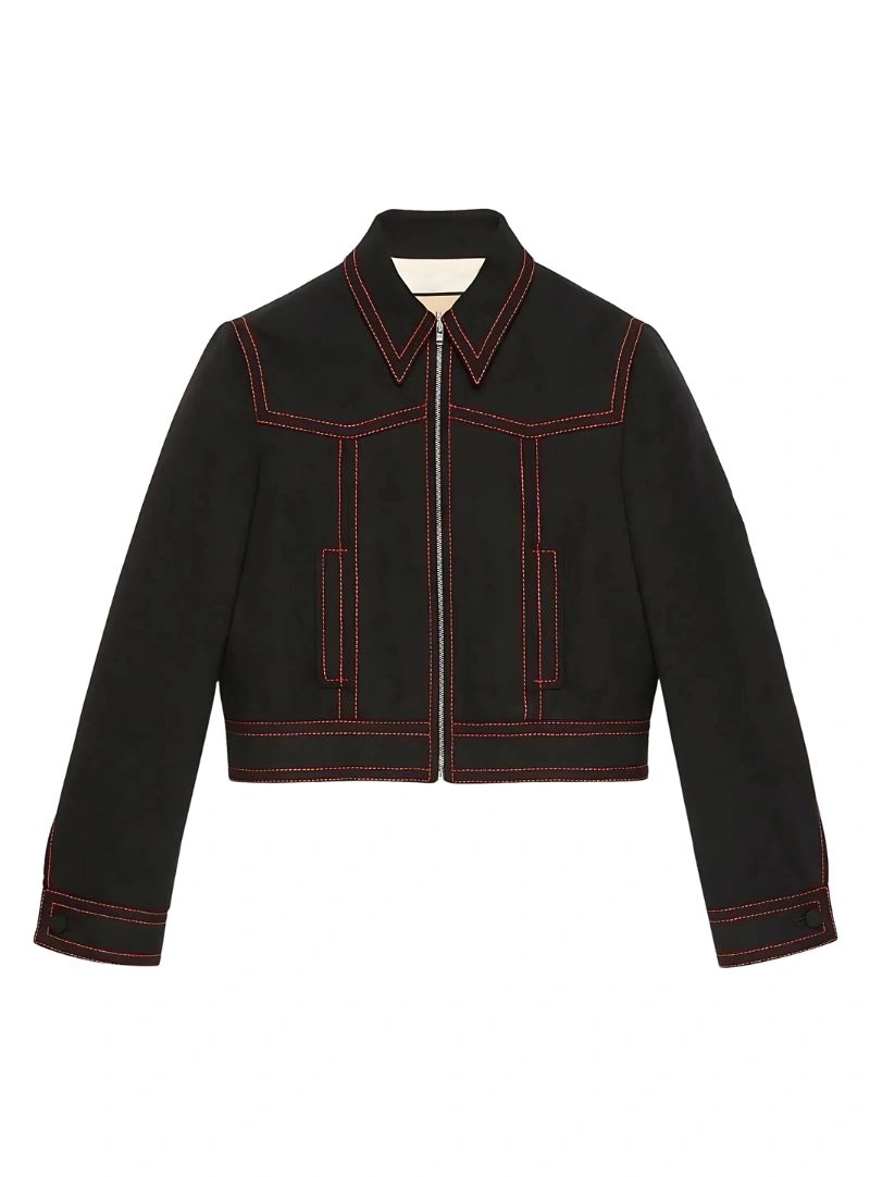 I love this jacket so much! The cropped style looks great on everyone, and the red stitching really stands out. It looks just like the one Jenna wore – stylish and bold.