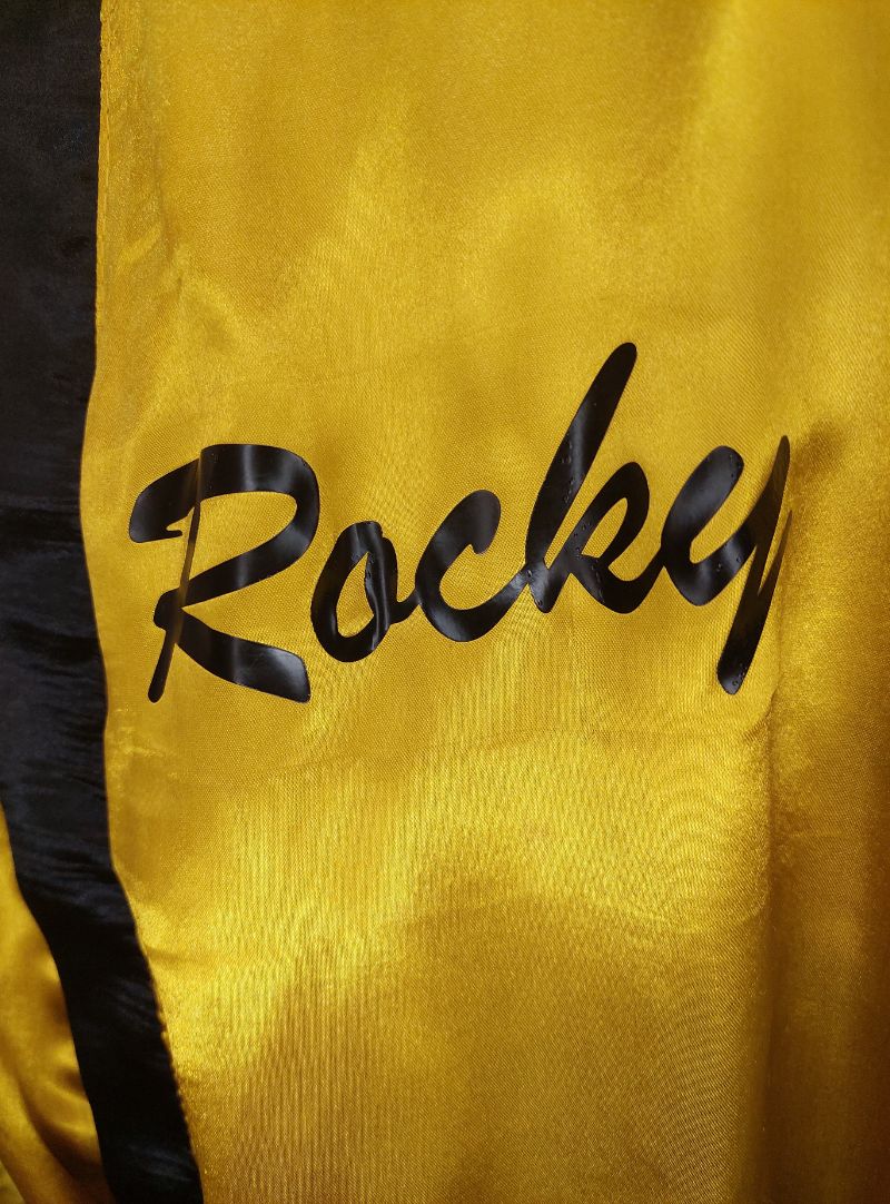 Truly iconic piece! This fighting robe from Rocky III is stunning! The silk on the outside feels luxurious, and the polyester on the inside makes it easy to wear. The Rocky logo on the chest and the Italian Stallion logo on the back are both made perfectly.