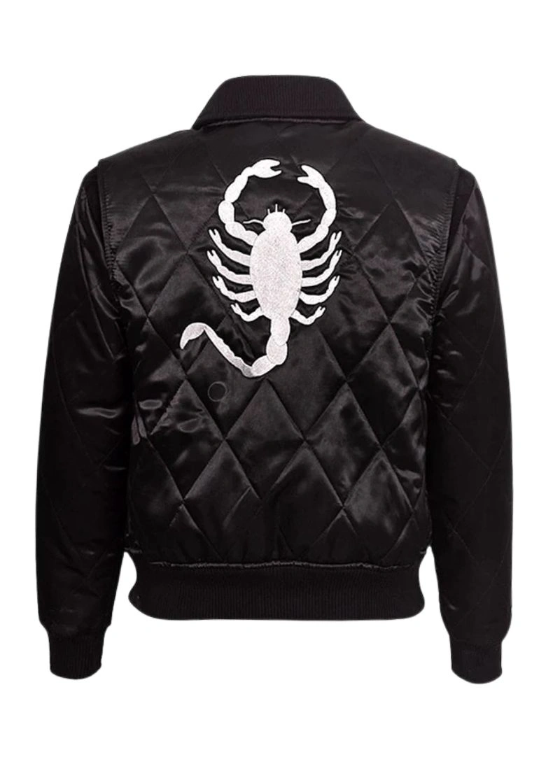 The jacket looks like it came straight out of a movie! The satin fabric feels smooth and high-end, with an excellent, soft gloss that reflects light well. I got the white one, and the golden scorpion embroidery on the back is very well done, with neat stitching and much attention to detail.